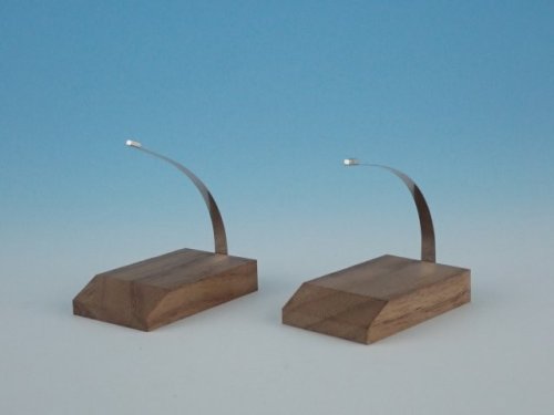 マイクロウィングシリーズ専用のスタンド(2個入り)x3セット、計6個入りです。ウォールナットの木製台とステンレス製のアームの組み合わせ。カッターナイフや接着剤は不要です。付属の両面テープとアルミテープを使って完成します。すでに組み立てた機体に取り付けられます。